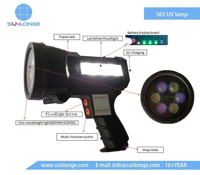1.SL8906-UB multi-function inspection lamp is with 6 pcs powerful LED, with 2 different wavelength combination,3 pcs 365NM UV light, 3 pcs 455 blue light. (you can choose different wavelength combination: 365NM,395NM,455NM,525NM,595NM,625NM,6000K), side lighting function as well.
