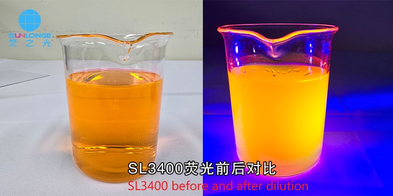 SL3400 Water soluble fluorescent green tracer dye is a concentrated water-soluble fluorescent tracer dye containing styrene derivative. The product is orange transparent liquid after dilution, and is fluorescent orange under UV light.The product is very good at acid resistance and can be excellent fluorescent properties even at lower or higher PH values; excellent sunlight fastness and fastness to acids/alkali fastness.